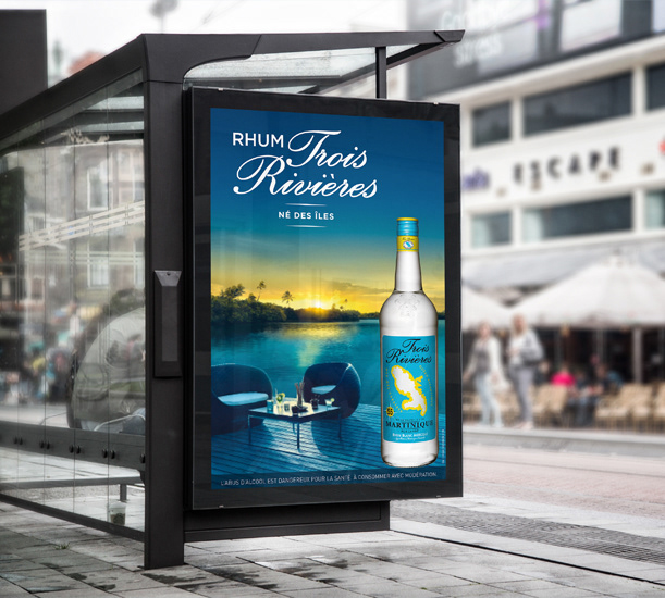 Déclinée sur des affiches abribus et 4x3, met en avant le produit dans un cadre chic et décontracté, évoquant l'élégance d'une terrasse ensoleillée et transportant le consommateur vers l'atmosphère authentique et raffinée des îles.
